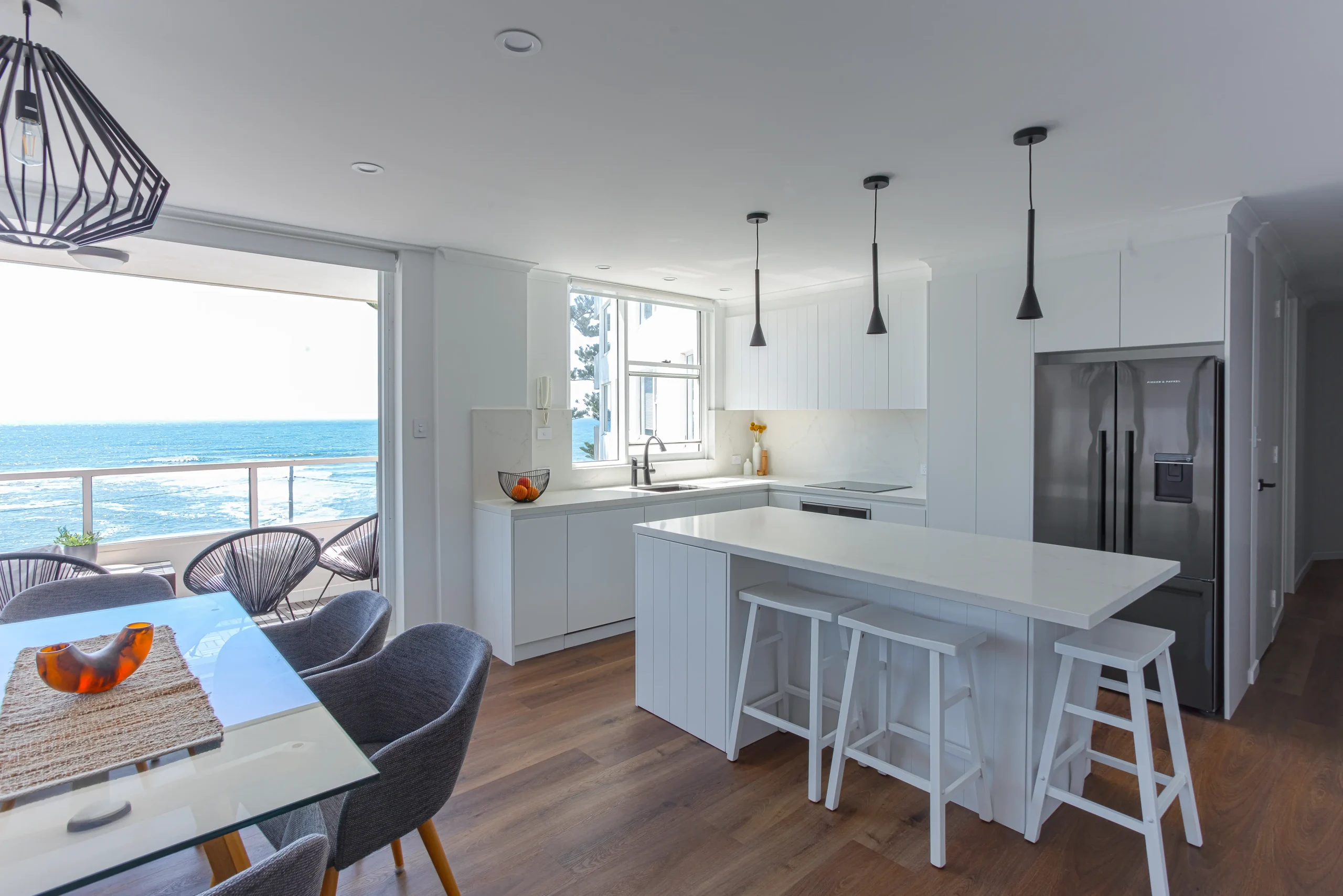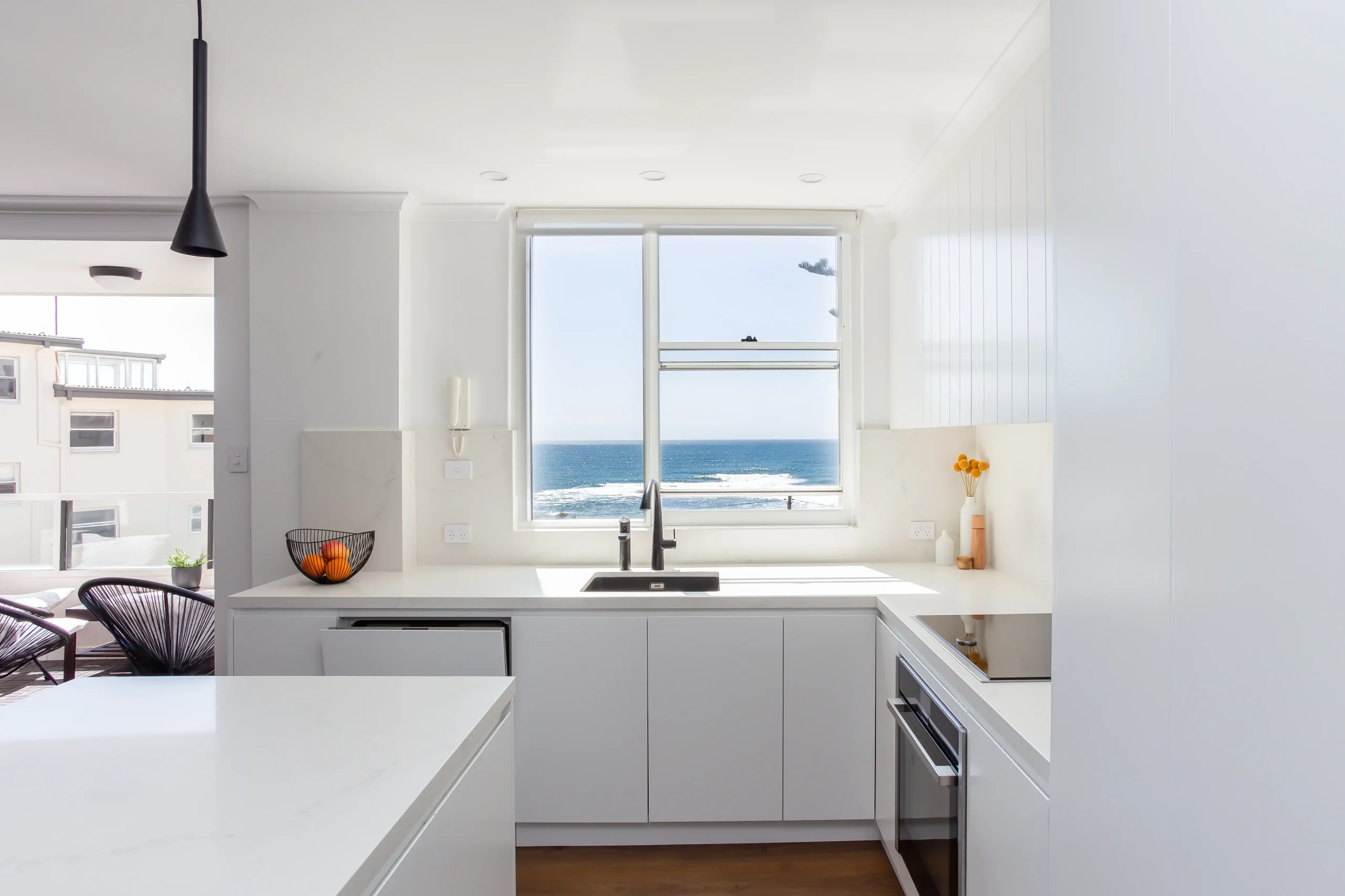SORTED. Projects was “stoked” to deliver an apartment that is now a light-filled, open-plan sanctuary that celebrates its coastal location. With uninterrupted views of the ocean and Shark Island, every design decision was made to frame the view and elevate the lifestyle