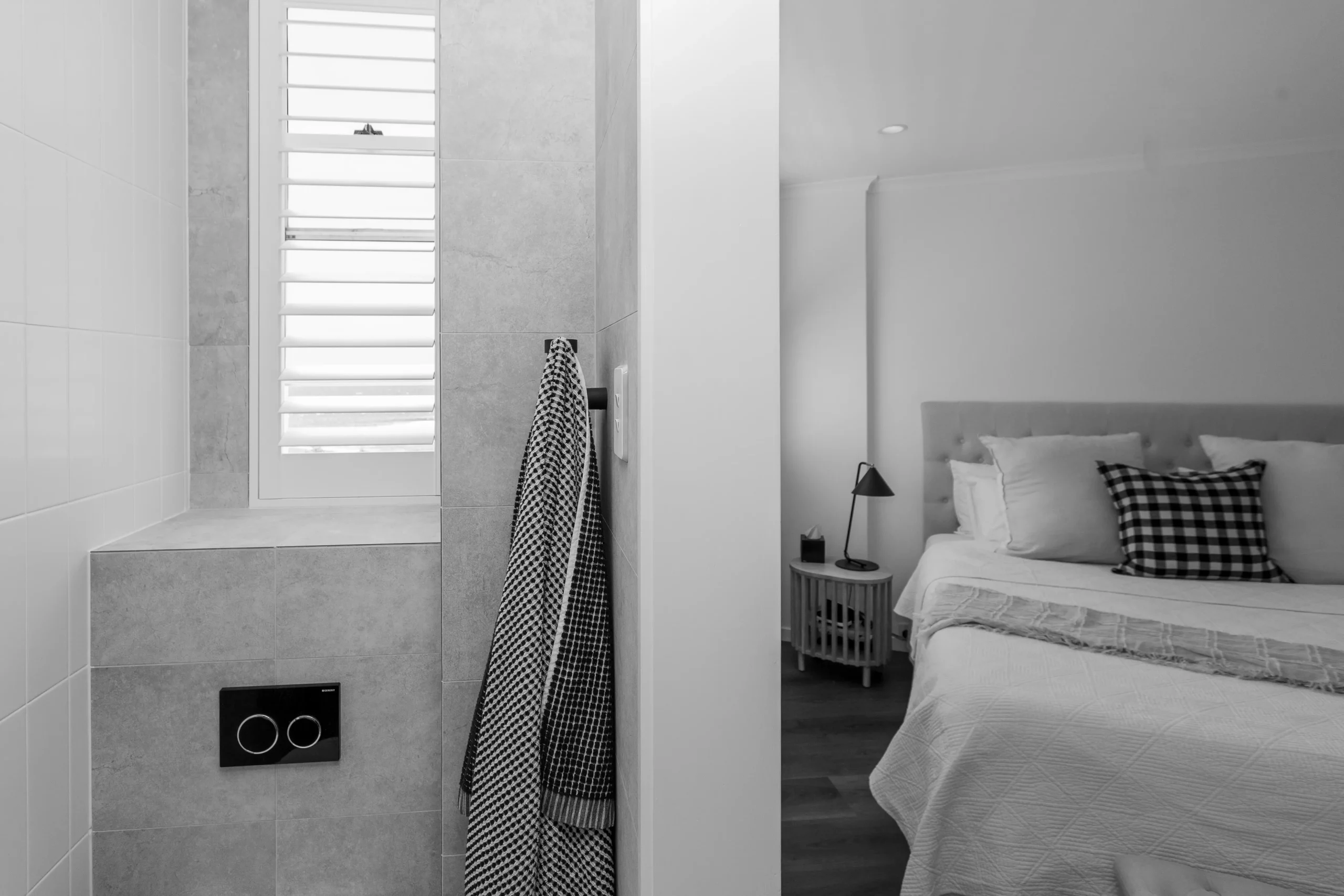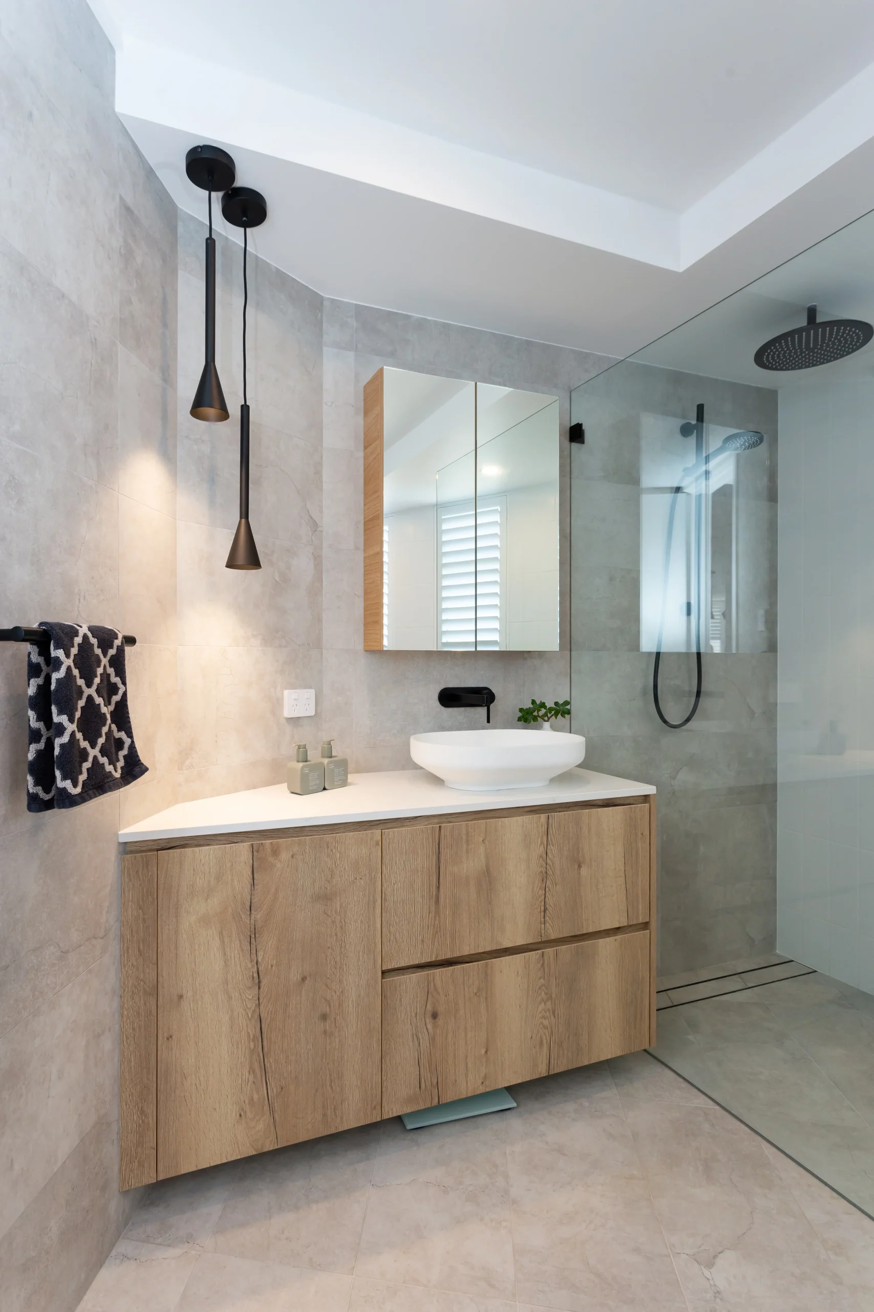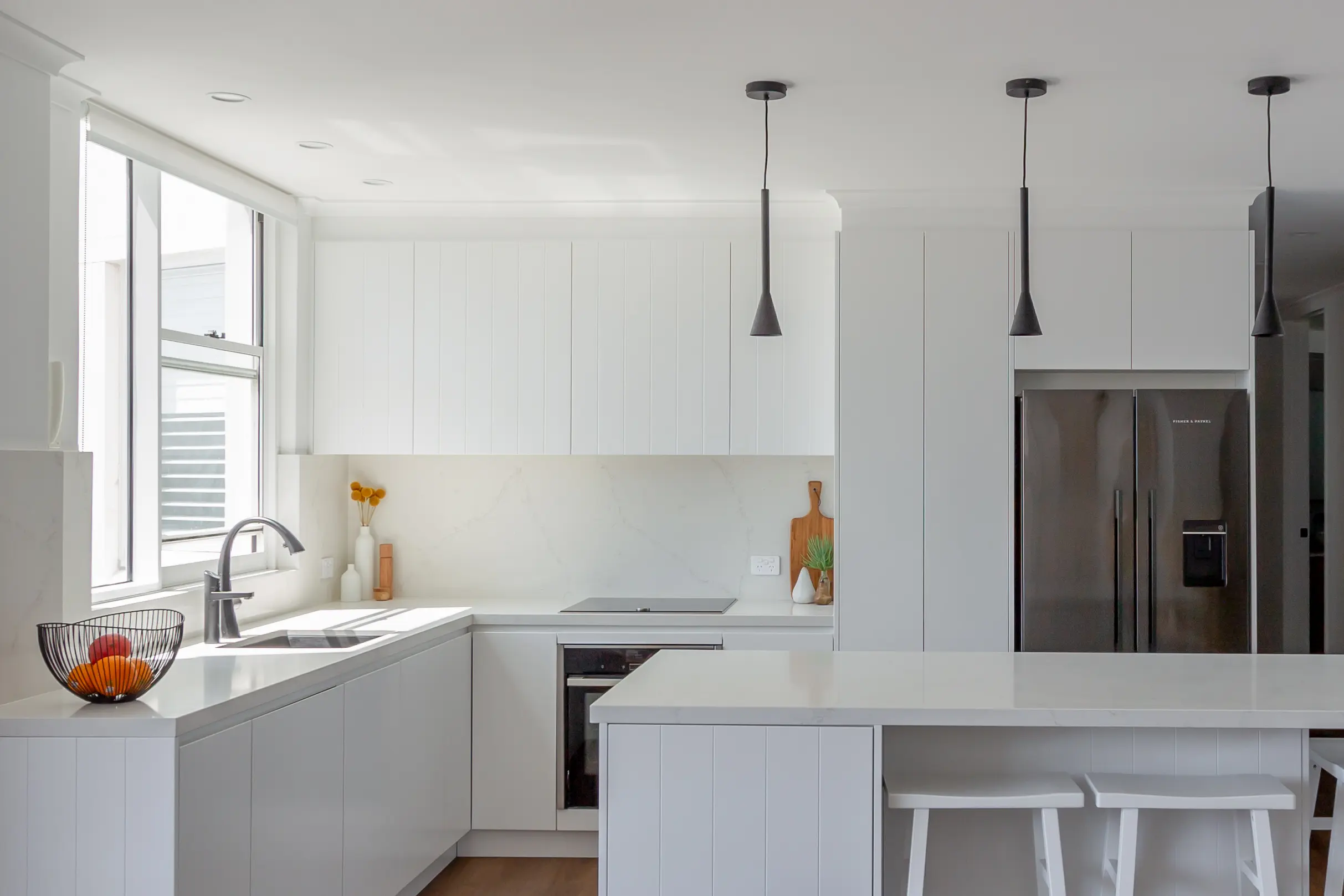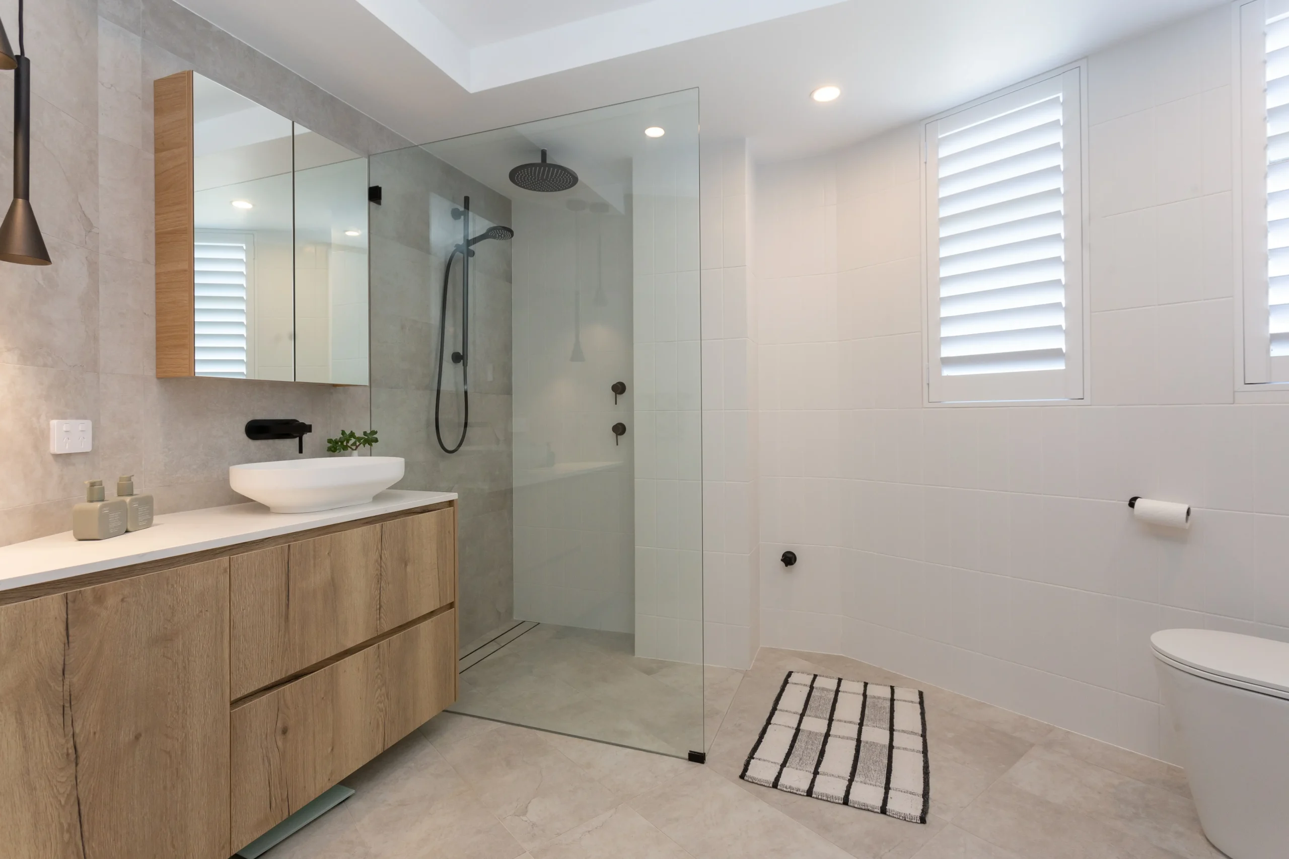 Both bathrooms were reconfigured with a focus on space, light, and luxury —featuring walk-in showers, premium fixtures, and minimalist finishes. - Custom Kitchen & Laundry Joinery: